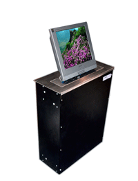 液晶屏升降器主要應用于大型會議室,高級多媒體網絡系統,當需要舉行會議時隱藏在會議桌內的升降機把顯示屏從會議桌下面自動升到桌面并仰成一成角度,符合人機工程學原理,產品也可以左右調節角度,更有利于辦公演示的需要,當不使用時顯示屏可自動下降隱藏于會議桌內部,并自動關門,產品具有防盜、防塵保持桌面平整,美化桌面等功能。最新研制生產的同步帶傳輸液晶顯示屏升降器,克服了鏈條、和齒條升降器的噪音大、油污多、傳動不穩定等缺點,是目前國內最新液晶屏升降器的傳動方式。