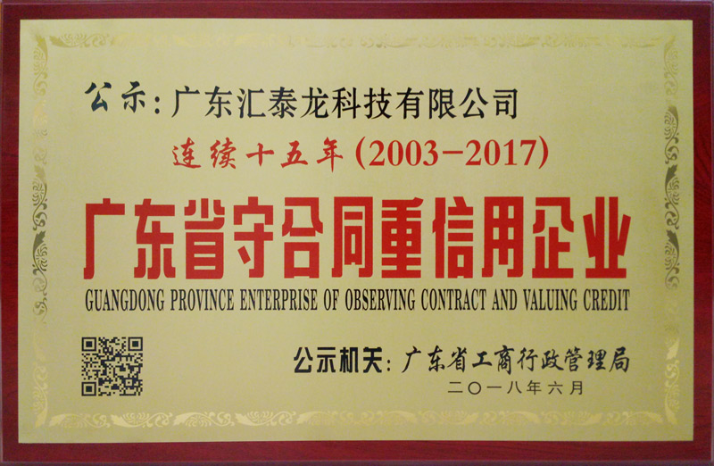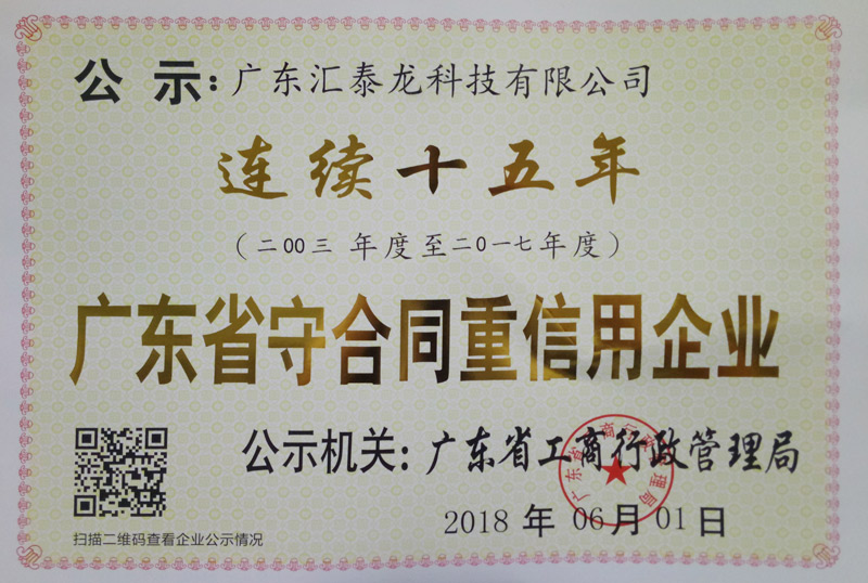 日前,經(jīng)廣東省工商行政管理局嚴(yán)格審核并予公示,廣東匯泰龍科技有限公司被授予“連續(xù)15年(2003-2017)廣東省守合同重信用企業(yè)”榮譽(yù)稱號(hào)。