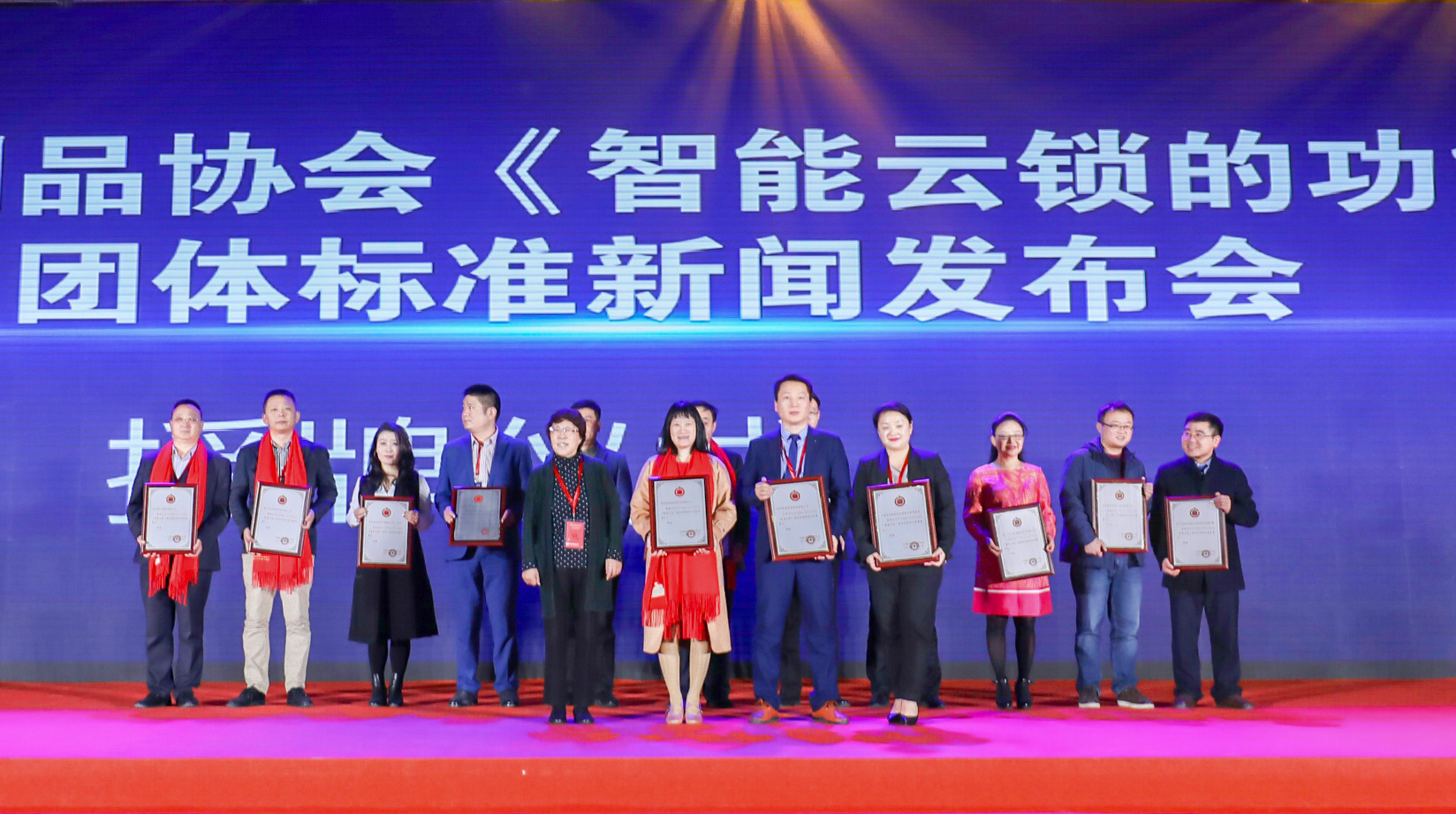 ▲中國五金制品協(xié)會理事長石僧蘭女士為《智能云鎖的功能要求》的團體標準各起草單位進行授牌