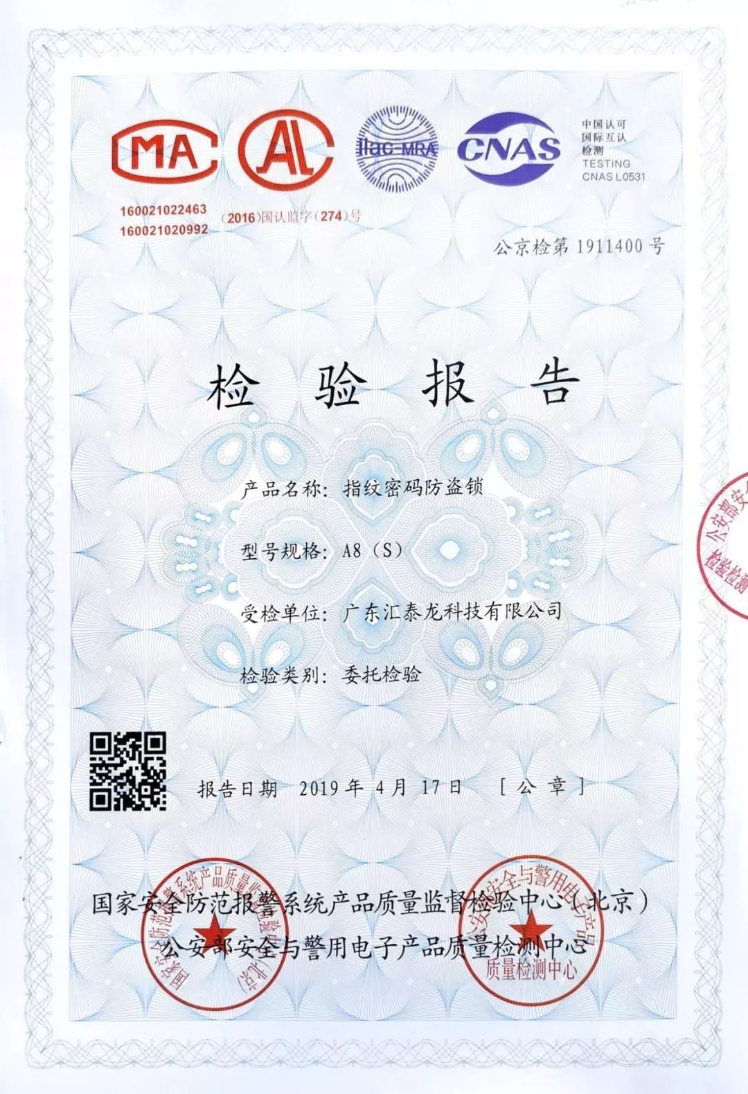 匯泰龍送檢的A8型指紋密碼防盜鎖,經(jīng)國家安全防范報(bào)警系統(tǒng)產(chǎn)品質(zhì)量監(jiān)督檢驗(yàn)中心(北京)公安部安全與警用電子產(chǎn)品質(zhì)量檢測中心檢驗(yàn),通過強(qiáng)度、報(bào)警功能、高溫、低溫、振動(dòng)、沖擊、自由跌落、抗靜電放電干擾、阻燃、防磁場技術(shù)(小黑盒)開啟、互開、防破壞能力等60余項(xiàng)與安全息息相關(guān)的檢驗(yàn)。