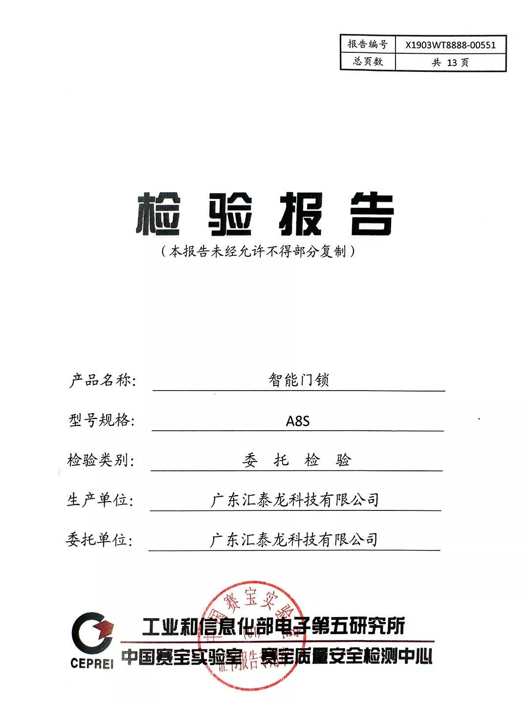 匯泰龍A8s旗艦智能鎖通過國家安全防范報(bào)警系統(tǒng)產(chǎn)品質(zhì)量監(jiān)督檢驗(yàn)中心、公安部安全與警用電子產(chǎn)品質(zhì)量檢測(cè)中心關(guān)于高溫、低溫、沖擊、自由跌落、阻燃、防磁場(chǎng)技術(shù)開啟、防破壞能力等60余項(xiàng)與安全息息相關(guān)的權(quán)威檢驗(yàn)。