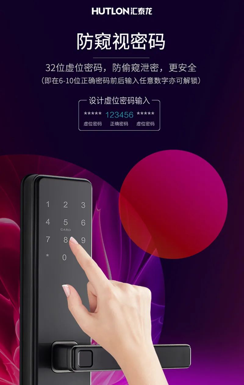 虛位密碼技術(shù),是密碼開鎖中的一種。匯泰龍智能鎖支持的虛位密碼,我們可以在連續(xù)的正確密碼的前后,隨意輸入不規(guī)則數(shù)字,只要中間有連續(xù)正確的密碼就可開門,掩蓋真實密碼,做到防窺視。