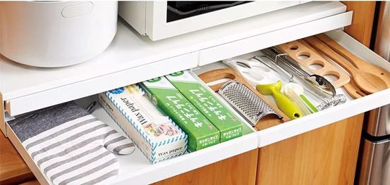 適當(dāng)加多抽屜的使用,拉開(kāi)抽屜就可以看全里面的東西,不用為了找一罐黃豆就翻箱倒柜,也提高櫥柜的利用率。