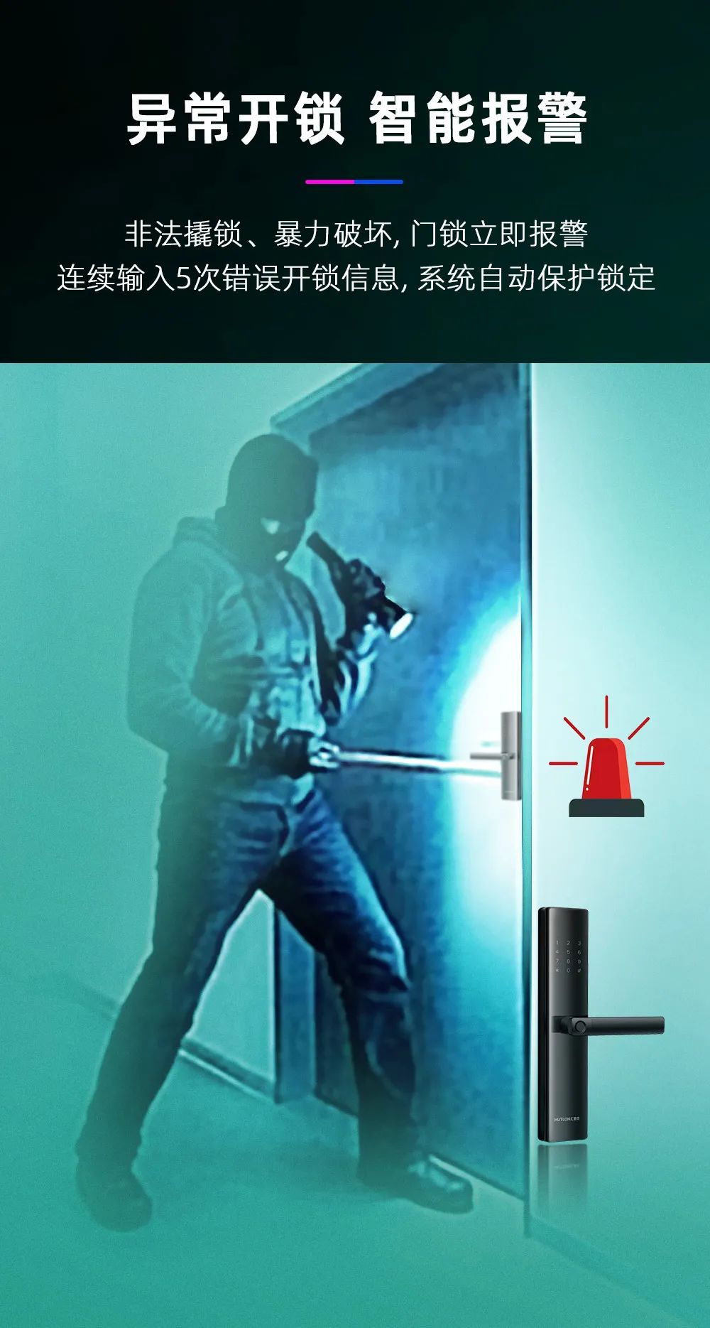 多次錯誤自動鎖定,防猜解。5分鐘內驗證密碼/指紋或者感應卡連續(xù)錯誤5次,門鎖自動鎖定100秒,并語音提示“門鎖已鎖定”,防止不法分子猜解開鎖。