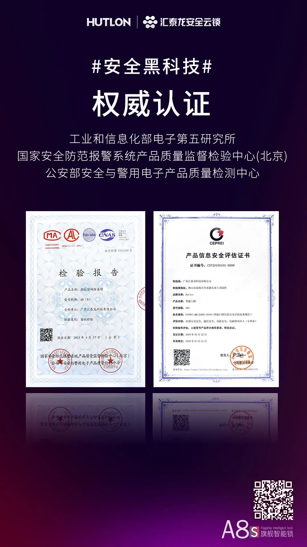 但!這還不夠!匯泰龍A8s智能鎖通過工業(yè)和信息化部電子第五研究所、國家安全防范報(bào)警系統(tǒng)產(chǎn)品質(zhì)量監(jiān)督檢驗(yàn)中心(北京)、公安部安全與警用電子產(chǎn)品質(zhì)量檢測(cè)中心的檢驗(yàn),質(zhì)量無可挑剔!