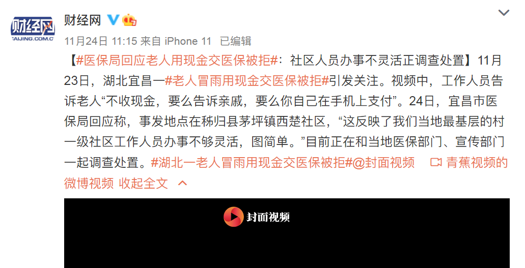 但最讓人感到心疼的,是“老人冒雨用現(xiàn)金交醫(yī)保被拒”事件。