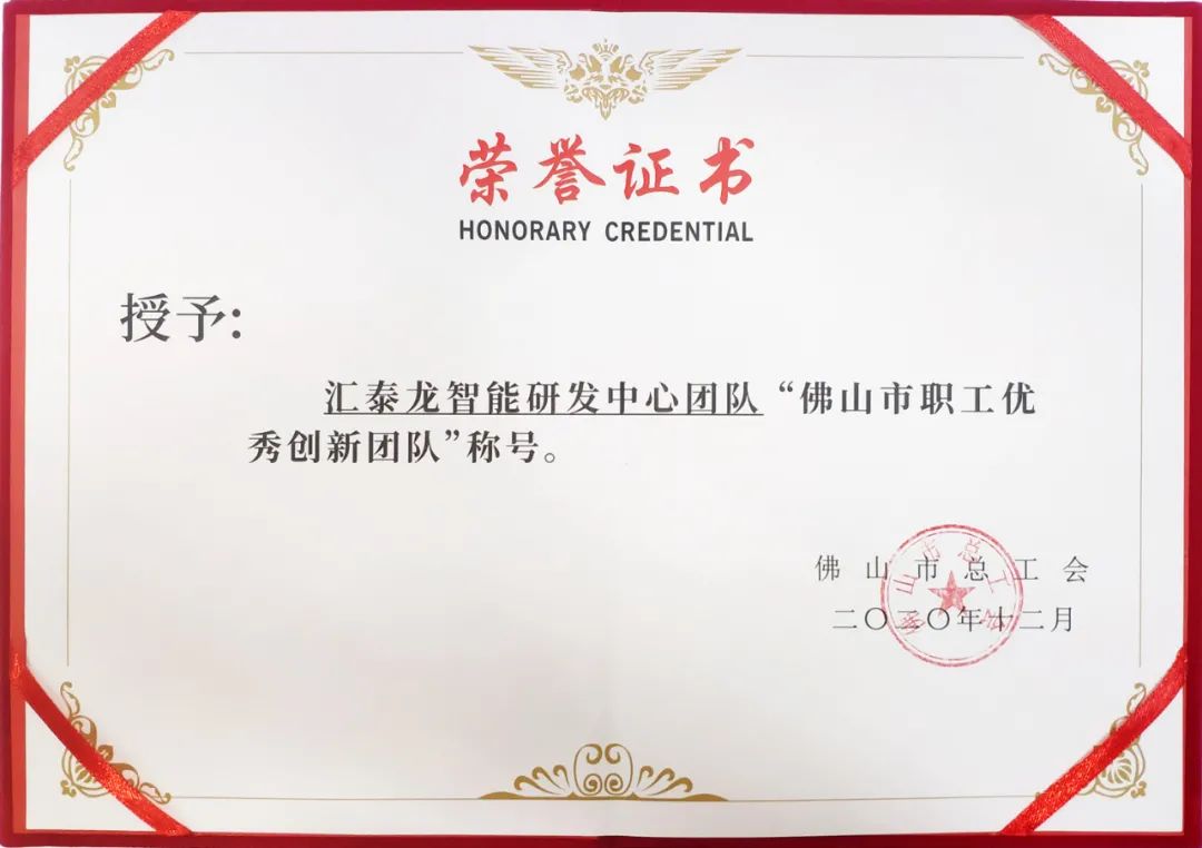 匯泰龍獲“佛山市職工優(yōu)秀發(fā)明創(chuàng)新大賽三等創(chuàng)新成果獎”,匯泰龍智能研發(fā)中心團隊榮獲“佛山市職工優(yōu)秀創(chuàng)新團隊”稱號,是對匯泰龍人才與創(chuàng)新戰(zhàn)略、研發(fā)成果量產(chǎn)化、推動行業(yè)發(fā)展實力的極大認可。