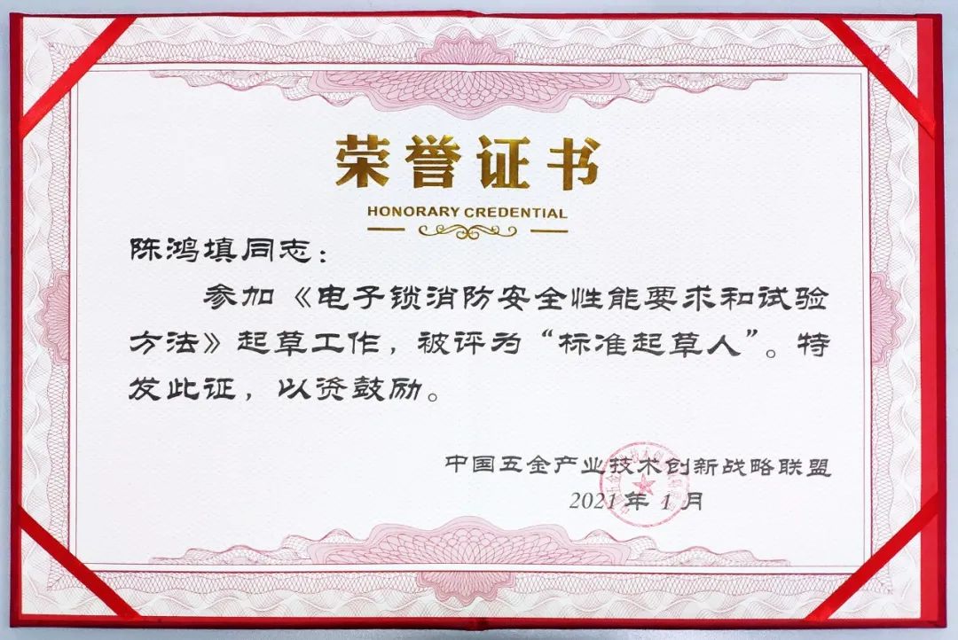 作為《電子鎖消防安全性能要求和試驗(yàn)方法》的起草單位,匯泰龍榮膺“標(biāo)準(zhǔn)起草單位”榮譽(yù);匯泰龍陳鴻填董事長參與標(biāo)準(zhǔn)的起草,榮膺“標(biāo)準(zhǔn)起草人”榮譽(yù)。