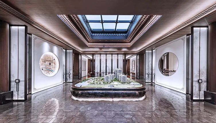 空間布局采取一軸三進(jìn)院,一進(jìn)博雅閣、二進(jìn)暢和園、三進(jìn)澄泓園,打造獨(dú)屬于建發(fā)的“三進(jìn)門院”的歸家禮序空間。門頭、地雕等處用華紋和影壁景墻,構(gòu)建中式風(fēng)雅。