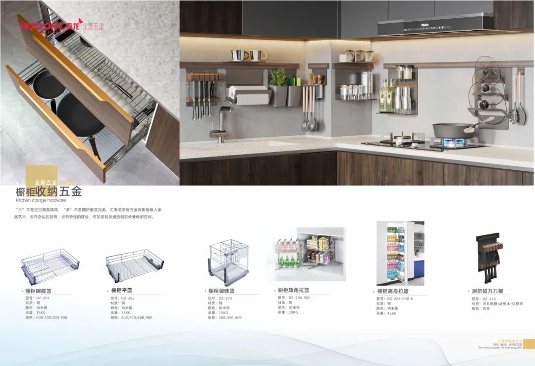 按動(dòng)線規(guī)劃,巧用每一寸平面和立面空間,碗碟籃、平籃、調(diào)味籃、轉(zhuǎn)角拉籃、高身拉籃、升降籃、磁力刀架等多類(lèi)型廚房收納五金,發(fā)揮“小空間,大收納”的作用,將柴米油鹽的生活瑣事變得井然有序,讓廚房承包全家人的“味蕾記憶”。