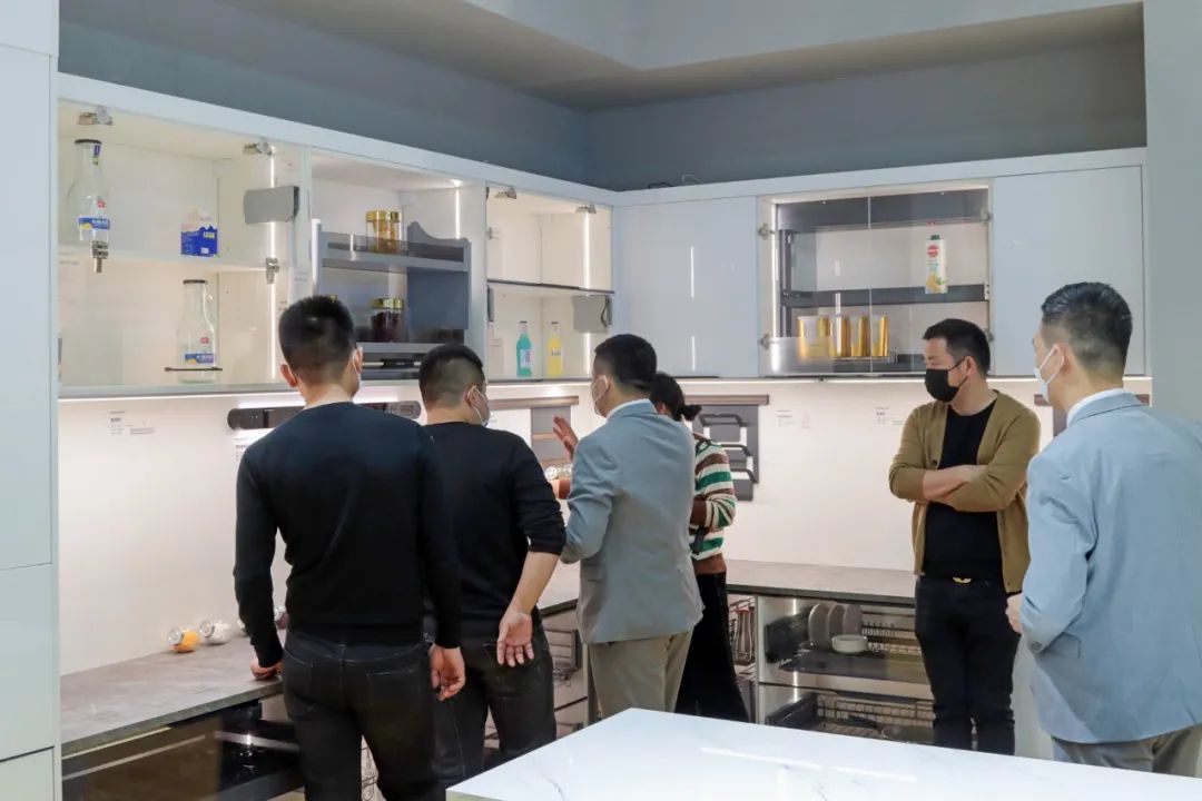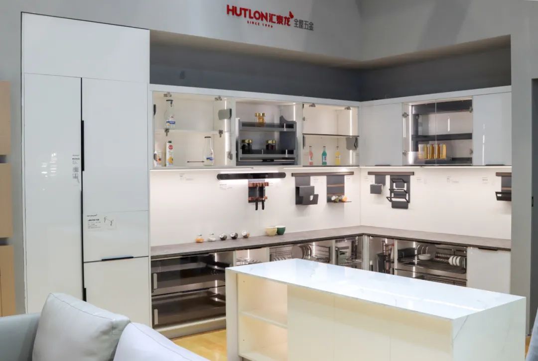 在廚房場(chǎng)景中,客商體驗(yàn)到智能廚具升降機(jī)、碗碟籃、平籃、調(diào)味籃、轉(zhuǎn)角拉籃、高身拉籃等廚房收納五金,發(fā)揮“小空間,大收納”的作用,讓柴米油鹽的生活瑣事變得井然有序。