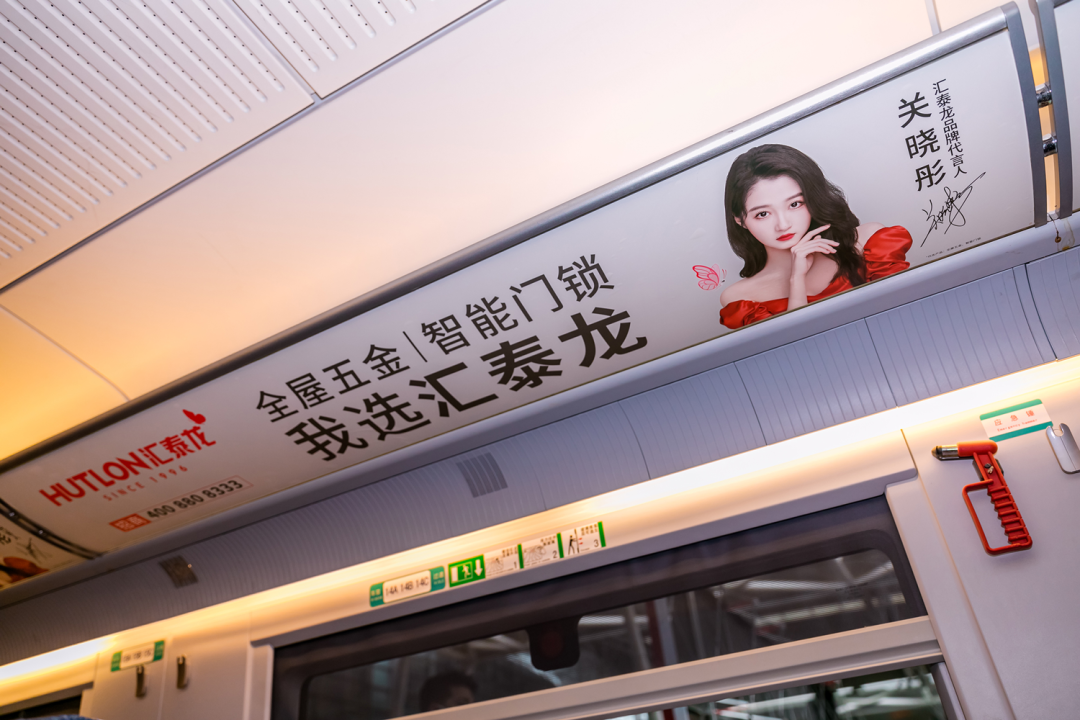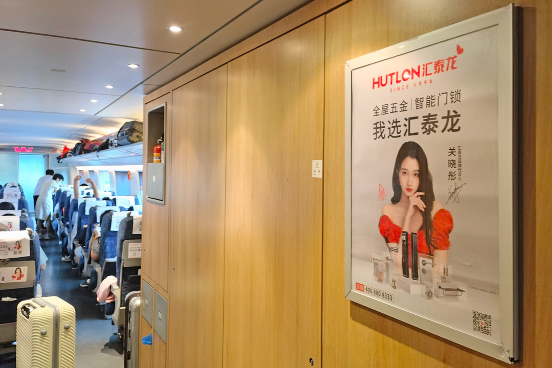 車廂內(nèi),報(bào)站語音廣播廣告、以及匯泰龍品牌代言人關(guān)曉彤KV廣告遍布在門貼、海報(bào)、頭枕、桌板、品牌長(zhǎng)廊、LED字幕等車內(nèi)多元化、視聽結(jié)合的全媒體廣告,多方位、高頻次傳播“全屋五金丨智能門鎖 我選匯泰龍”,構(gòu)建起匯泰龍品牌專屬的全方位傳播空間,也是穿梭在祖國(guó)大地上一道靚麗的品牌風(fēng)景線。