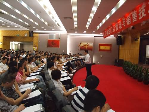 7月6日早8點50分,廣州全球通大酒店的大會議室內(nèi),動感的音樂讓人精神抖擻,如期到會的全國各地的經(jīng)銷商及門店經(jīng)理、店員濟濟一堂,大家都在熱切地期待著課程開始。9點整,在培訓主持人、總部總經(jīng)理助理熊衛(wèi)軍先生的隆重介紹下,中國門店銷售實戰(zhàn)講師、美國國際訓練協(xié)會PTT培訓師王延廣先生在熱烈的掌聲中登場。