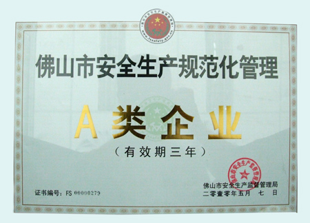 專家組自2009年10月對我司安全生產(chǎn)規(guī)范化管理工作作綜合評估,對我司安全生產(chǎn)管理相關(guān)的記錄資料進行了詳細的審核,同時專家組也親臨生產(chǎn)現(xiàn)場進行了嚴謹?shù)陌踩a(chǎn)工作考察,并且現(xiàn)場宣布了評定我司為佛山市安全生產(chǎn)規(guī)范化管理A類企業(yè)審核。