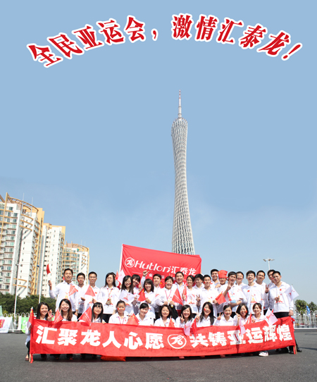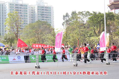 “亞運加油!中國加油!匯泰龍加油!”,2010年11月9日11時25分28秒,當?shù)?55棒火炬手經(jīng)過廣州著名標志性建筑—廣州塔時,藝洲路上的匯泰龍員工迎火炬代表方隊響起了潮水般的歡呼聲,氣氛熱烈。四十多名匯泰龍員工手舞國旗、公司旗,舉起寫滿著匯泰龍員工簽名橫副,滿載著全體匯泰龍人對亞運的祝福,在大道旁為火炬手歡呼鼓勁,為亞運圣火傳遞助威!