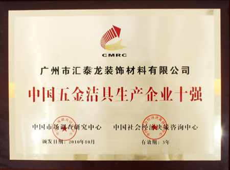 2010年11月,由中國市場調(diào)查研究中心和中國社會經(jīng)濟決策咨詢中心聯(lián)合組織的“中國五金潔具生產(chǎn)十強企業(yè)、中國五金潔具生活十大暢銷品牌”的評比活動結(jié)果揭曉,匯泰龍公司榮膺“中國五金潔具生產(chǎn)企業(yè)十強”、“中國五金潔具生產(chǎn)十大暢銷品牌”的稱號,并獲得證書和獎牌。這是匯泰龍公司再一次榮獲全國性的獎項,標志著企業(yè)品牌進一步得到行業(yè)及消費者的充分認可。此次的評選結(jié)果將在《中國日報》和國家質(zhì)檢總局主管、中國質(zhì)檢報刊社主辦的中國品牌雜志社以及中國市場調(diào)查研究中心、中國社會經(jīng)濟決策咨詢中心官方網(wǎng)站予以公布。