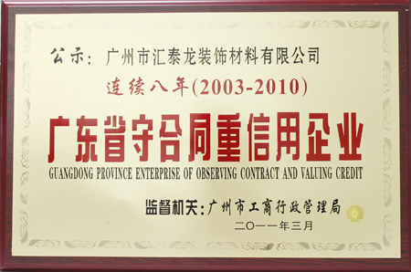 2011年3月,廣州市工商行政管理局對獲得“守合同重信用”的廣州匯泰龍裝飾材料有限公司等企業(yè)進(jìn)行表彰,此次是匯泰龍公司連續(xù)八年獲得“守合同重信用企業(yè)”稱號。這是對匯泰龍公司守法經(jīng)營、依法納稅、講究信用、誠信經(jīng)營、品牌影響的充分肯定。