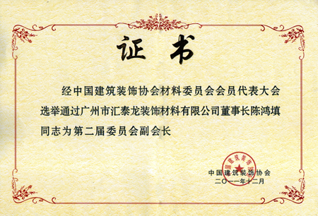 正因?yàn)槿绱耍袊?guó)建筑裝飾界最權(quán)威的組織——中國(guó)建筑裝飾協(xié)會(huì),于近日欣然授予匯泰龍公司“中國(guó)建筑裝飾協(xié)會(huì)材料委員會(huì)副會(huì)長(zhǎng)單位”的榮譽(yù),同時(shí)授予匯泰龍董事長(zhǎng)陳鴻填先生"第二屆委員會(huì)副會(huì)長(zhǎng)"榮職,這也是繼2011年全國(guó)裝飾材料工作會(huì)議上董事長(zhǎng)榮獲“優(yōu)秀企業(yè)家”、公司榮獲“全國(guó)裝飾材料行業(yè)優(yōu)秀企業(yè)”后的又一殊榮。