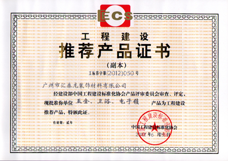 經過嚴格的審查、審核、審批程序,中國工程建設標準化協會于6月29日正式頒發匯泰龍裝飾材料有限公司《工程建設推薦產品證書》。