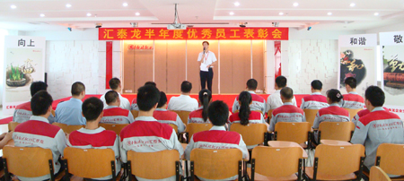 7月20日,匯泰龍佛山南海生產基地辦公樓五樓會議廳聲樂交響、燈火通明,匯泰龍2012年度第二季度優秀員工(七級員工)表彰大會隆重召開。公司人事行政中心總監任志平先生、制造中心生產管理部經理張祖林先生、各車間主任及優秀員工到會,會議上任總監首先發表了講話,他在演講中提到,一個優秀的企業離不開每一個優秀的團隊,優秀的團隊的品質必須由每一位優秀品質的員工才能體現,受表彰的幾位優秀員工在平凡的崗位上兢兢業業,足以成為匯泰龍人學習的榜樣,接著他宣讀了《2012年度第二季度優秀員工名單》,公司領導對這些經民主投票評選出的優秀員工進行頒發榮譽證書并進行表彰,獲獎員工覃云清、李登芳代表全體優秀員工發言,最后,所有嘉賓與優秀員工合影留念。表彰大會氣氛熱烈,在圓滿完成會議議程之后,表彰大會隆重閉幕。