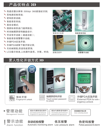 此款智能門鎖以其優越的核心軟件系統與指紋掃描技術、外觀設計方面表現突出,此款智能鎖外表簡約有力,安裝簡單,環保節能-自帶電池可使用5年時間。此鎖設計簡約大方,線條流暢,現代感極強,迎合大眾審美要求。豐富的表面處理與各式把手的提供可滿足你各種裝修風格要求。貼心的幫助系統可讓用戶方便地查詢有關門鎖,操作,使用等問題。