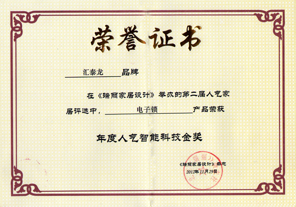 據悉,該次評選活動通過國內最具影響力的網絡、雜志媒體平臺宣傳,憑借讀者群的真實投票、行業專家與家居達人傾情參與,將年度最新潮、最環保、最具人性化的家居產品推廣至全國,匯泰龍電子鎖此次獲獎,是對匯泰龍電子鎖科技性、實用性、高品質的又一有力肯定!