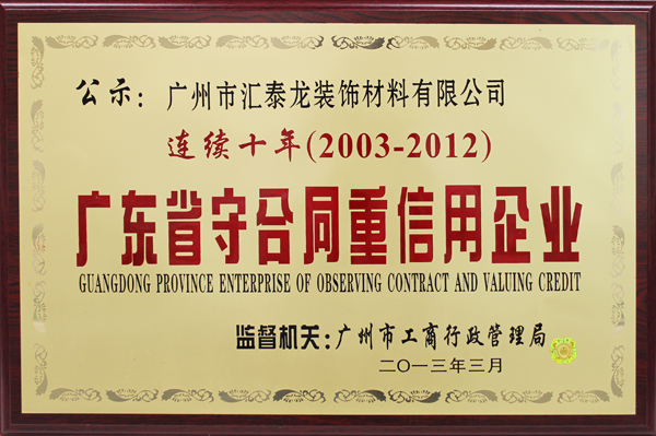 匯泰龍公司自成立以來,嚴格遵守《中華人民共和國合同法》和公司關于合同管理的相關規定、強化合同管理機制、加強公司合同信用建設。經過十七年的發展,匯泰龍人深刻理解“人無信不立,企無信不興”這一信條,并以“品質造就滿意”作為經營理念深深的把“誠信”植根于每一個匯泰龍人的心中,把“誠信”貫徹到日常工作的方方面面。“廣東省守合同重信用企業”榮譽稱號是誠信企業的金字招牌,是對企業信用的最權威評定。誠信是企業發展的興業之本,更是企業塑造品牌的立足之本。匯泰龍把“守合同重信用”作為打造成社會誠信的標榜,積極做好誠信體系建設,為打造“誠信廣州”和促進中國裝飾材料行業市場又好又快發展做出新的更大的貢獻。