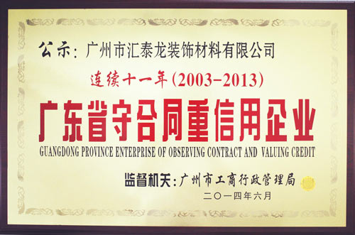 2014年6月,廣州市工商行政管理局對獲得“守合同重信用”的廣州匯泰龍裝飾材料有限公司等企業(yè)進行表彰,此次是匯泰龍公司連續(xù)十一年獲得“守合同重信用企業(yè)”稱號。同時被廣州市越秀區(qū)企業(yè)信用促進會評為理事單位,并頒發(fā)了牌匾及榮譽證書。這是對匯泰龍公司守法經(jīng)營、依法納稅、講究信用、誠信經(jīng)營、品牌影響的充分肯定。