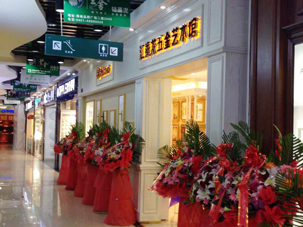 開(kāi)業(yè)當(dāng)天,花團(tuán)錦簇,無(wú)不彰顯出喜慶的氣氛。走進(jìn)哈爾濱匯泰龍五金藝術(shù)館,整體裝修風(fēng)格華麗、高雅、古典,形式上以浪漫主義為基礎(chǔ),在每一處細(xì)節(jié)中都蘊(yùn)涵深深的韻味,讓藝術(shù)館散發(fā)優(yōu)雅而經(jīng)典的味道。