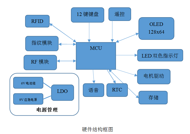 HZ-69206電控系統(tǒng)由主處理微控制器(MCU)、電源管理、非接觸M1卡讀取模塊(RFID)、顯示部分(OLED)、實(shí)時(shí)時(shí)鐘(RTC)、指紋讀取識(shí)別模塊、語(yǔ)音播放控制部分、遙控器接收模塊、信息存儲(chǔ)部分和狀態(tài)指示燈等部分組成,電控系統(tǒng)架構(gòu)圖如下,整體電路集成度較高,電路設(shè)計(jì)模塊化構(gòu)成,易于生產(chǎn)、維護(hù)提高產(chǎn)品的穩(wěn)定性。