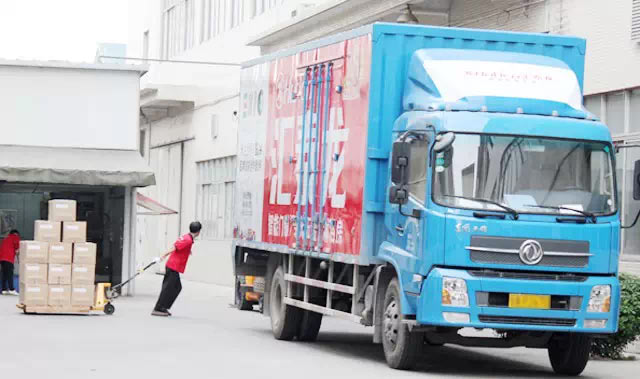 幾輛發(fā)貨車整齊停在車間門口,正在等待裝貨
