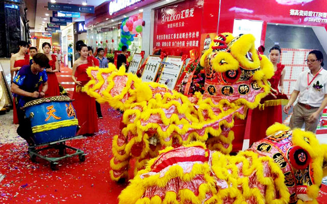 金獅生輝意融融,妙筆點(diǎn)睛展雄姿。經(jīng)銷商鄔湘萍女士、聶云安先生共同為舞獅進(jìn)行點(diǎn)睛,金色雙獅進(jìn)行獅舞表演,惹的現(xiàn)場(chǎng)熱鬧非凡。匯泰龍智能科技五金東莞長(zhǎng)安專賣店正式開業(yè)迎賓。在活動(dòng)現(xiàn)場(chǎng),還舉辦了現(xiàn)場(chǎng)砸金蛋、贏取電冰箱、大彩電、電風(fēng)扇等助興活動(dòng)。開業(yè)當(dāng)天全場(chǎng)6.8折更是賺足了人氣。
