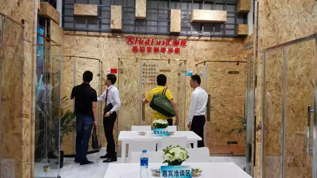 進(jìn)入E6館,一個(gè)碩大的由原木盒子構(gòu)成的主題展館吸引了客戶的眼球,公司的LOGO與2015年米蘭世博會(huì)色彩標(biāo)志相映成輝。十幾款精致的淋浴房巧妙地展示在展館內(nèi),原木色的墻壁,燈光從木盒子的縫隙中透射出來,投影在晶瑩的玻璃上。呼吸著木頭的香味,仿佛身處在初春晌午的森林中,這個(gè)就是匯泰龍上海廚衛(wèi)展“龍·自在”館。