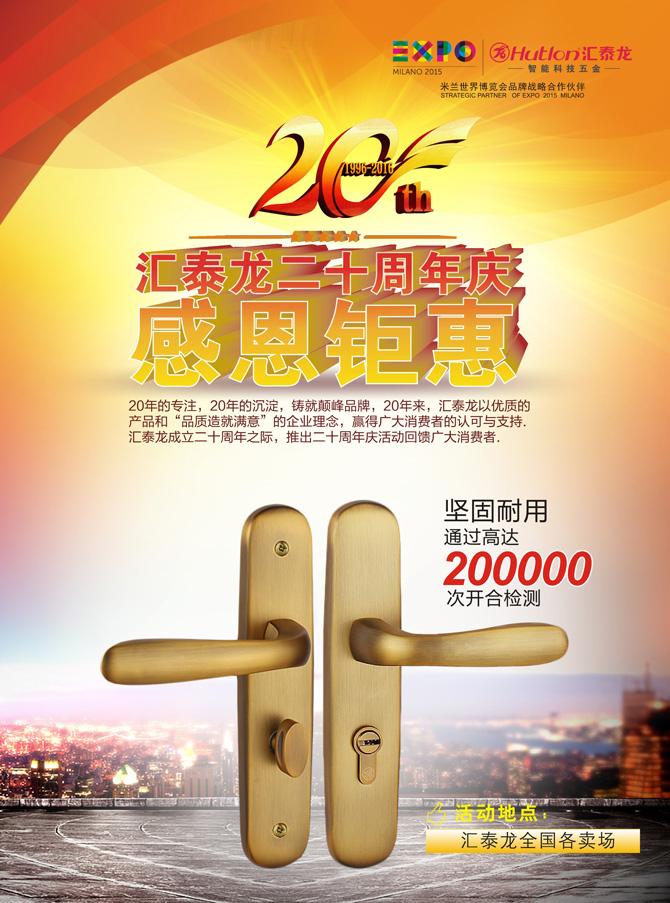20年的專注,20年的沉淀,鑄就巔峰品牌,20年來,匯泰龍以優(yōu)質的產(chǎn)品和“品質造就滿意”的企業(yè)理念,贏得廣大消費者的認可與支持。匯泰龍成立二十周年之際,推出二十周年慶活動回饋廣大消費者。