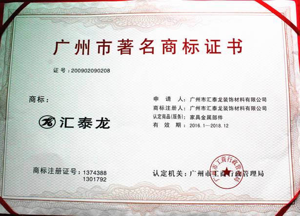 2016 年1 月,廣州市工商局在《廣州日?qǐng)?bào)》和官方網(wǎng)站發(fā)出公告,延續(xù)認(rèn)定“匯泰龍”商標(biāo)榮獲“廣州市著名商標(biāo)” 榮譽(yù)稱號(hào)。