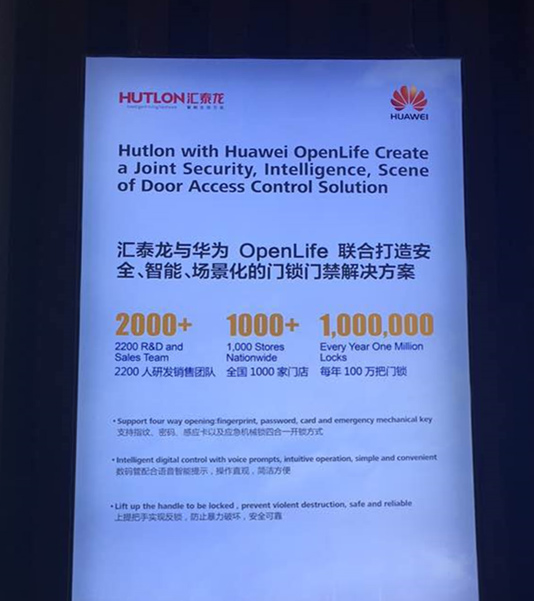 2016年9月2日,華為歷史上規(guī)模最大的面向ICT行業(yè)的全球生態(tài)大會——HUAWEI CONNECT 2016 在上海世博中心落下帷幕。匯泰龍作為華為OpenLife智慧家庭重要戰(zhàn)略合作伙伴之一應(yīng)邀亮相上海世博中心,面向全球120多個國家和地區(qū)的20000名業(yè)界精英,展示基于華為OpenLife智慧家庭生態(tài)的匯泰龍門鎖門禁解決方案,并憑此獲得華為開發(fā)者生態(tài)最佳解決方案獎。
