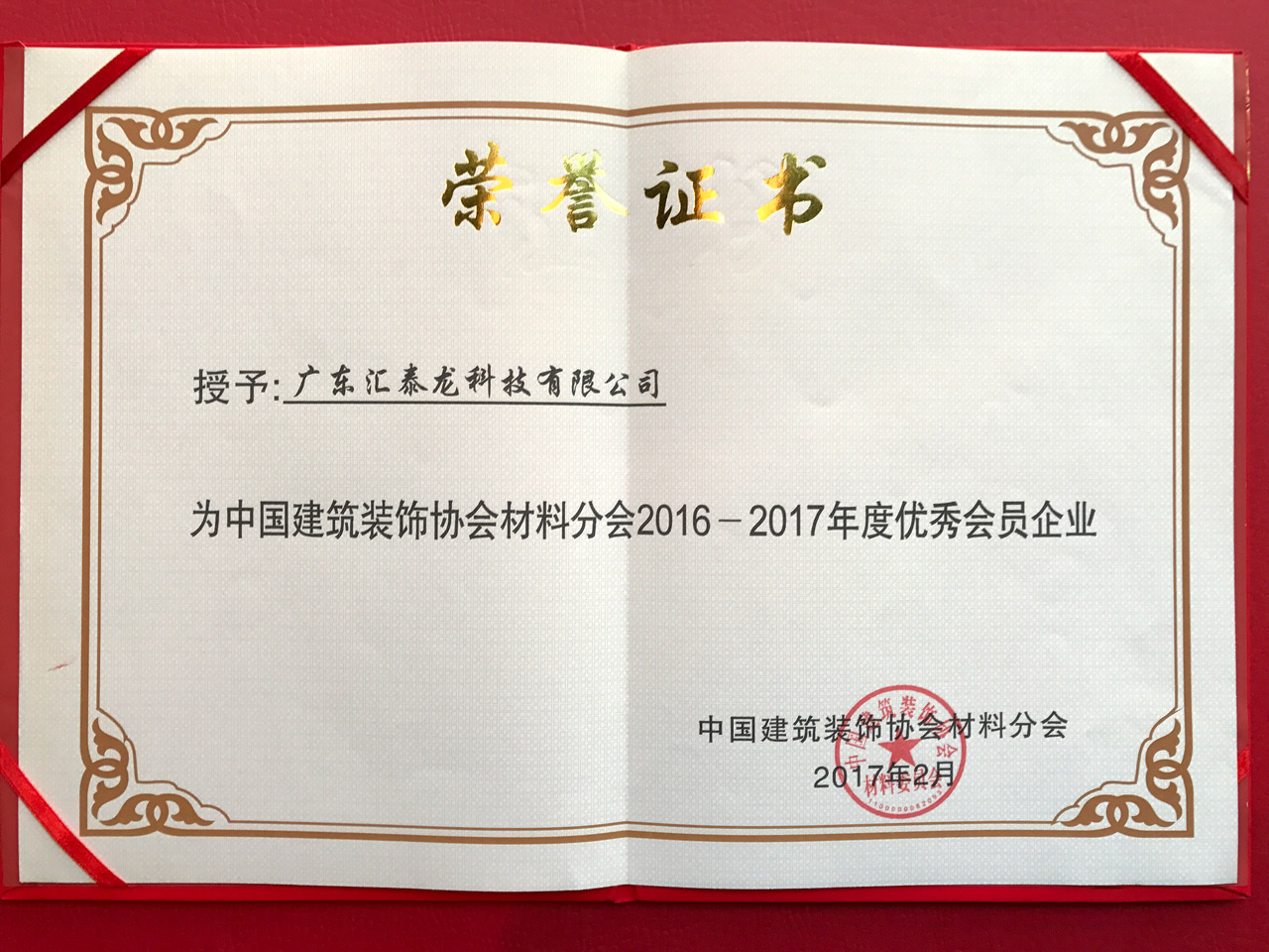 匯泰龍榮膺「中國建筑裝飾協(xié)會材料分會優(yōu)秀會員」