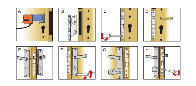 4安裝內(nèi)外面板,使把手轉(zhuǎn)動(dòng)順:擰緊螺釘(如上圖:E-F)。